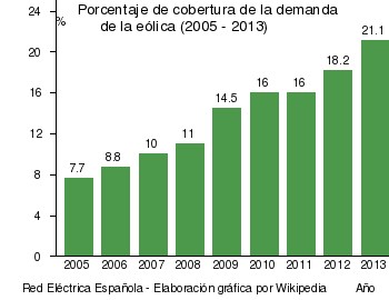 Es muy relevante la aportación de la energía eólica, siendo España uno de los países de Europa en el que la contribución de esta energía al total es de las más elevadas -en concreto, el 25 de diciembre de 2013 a las 2.56 horas la eólica cubrió el 68,5 % de la demanda total-. Dicha aportación está creciendo año tras año en la última década, tal y como muestra la siguiente gráfica: