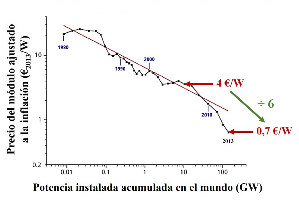 La evolución del precio del vatio solar desde 1980 hasta nuestros días puede verse en la siguiente gráfica, en la que se aprecia la influencia determinante de la cantidad de potencia instalada en el mundo como factor decisivo en la reducción del precio; esa tendencia se conoce como “curva de aprendizaje” de la ESF. La figura indica que cada vez que la potencia total instalada se duplico, el precio del vatio bajo un 20% y esto ha sido así durante los últimos 35 años. El precio del vatio solar en 2007, año en el que comenzó la participación significativa de la ESF en el “mix” energético español y en 2013, se muestran en la misma figura. Se aprecia una reducción en el precio de un año al otro en un factor 6: