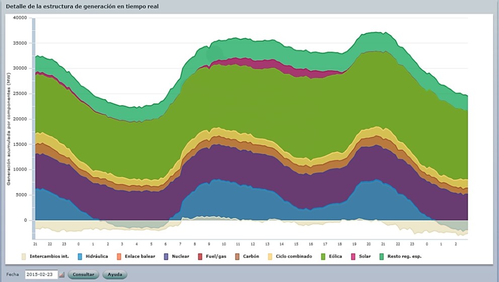Reparto por tecnologías de la energía producida el día 23-II-2015. La energía eólica (franja central de color verde oscuro) supuso, en promedio para todo el día, cerca del 50% del total de energía producida. Fuente: REE
