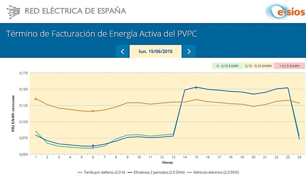 Precio horario de la electricidad para los consumidores acogidos al contrato PVPC (línea naranja) para el día 23-II-2015. Se muestran también los precios de la conocida como tarifa nocturna y los del vehículo eléctrico. Fuente: REE