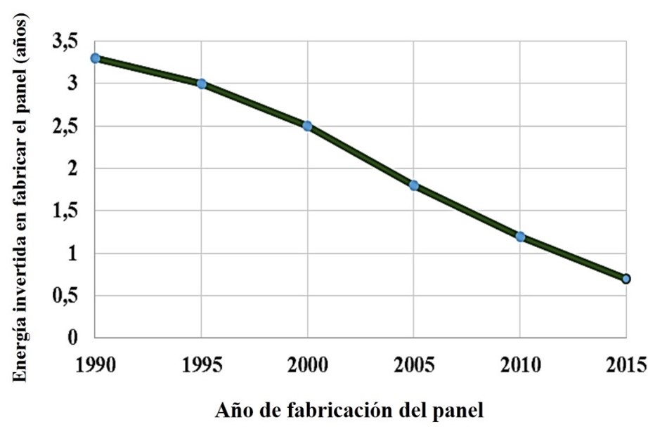 Tiempo de amortización energética o energía invertida en la fabricación e instalación de un panel fotovoltaico en función del año de fabricación. Elaboración propia a partir de los datos del Photovoltaics Report 2015 (Instituto Fraunhofer)