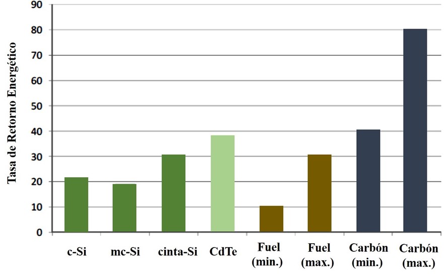 Los valores de la TRE para los distintos sistemas fotovoltaicos son similares o superiores a los que se obtienen con generación por fuel. Y los paneles que requieren menos energía en su construcción, basados en células de CdTe, tienen una TRE parecida al de las centrales de carbón menos eficientes. En localizaciones con elevados niveles de irradiación, la TRE puede llegar a 60, a lo que hay que añadir las emisiones de gases de efecto invernadero que se evitan, aspecto que trataré más adelante.
