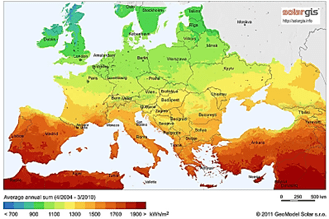 Niveles de irradiación en promedio anual para Europa. España disfruta de los más altos de todos los países de la UE. Fuente: Green Rhino Energy