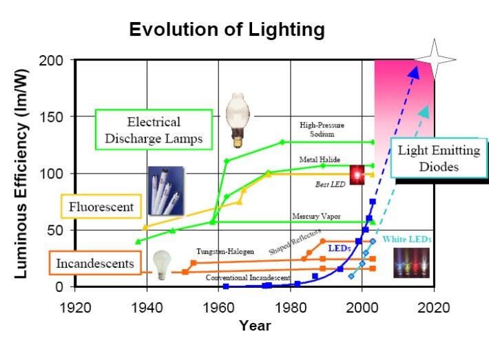 Desde su invención los LEDs han aumentado su eficiencia de manera espectacular, ya que es un sector industrial en crecimiento ininterrumpido, incluso en los peores años de la crisis económica. Una de las principales empresas fabricantes del mundo, la estadounidense Cree, obtuvo en marzo de 2014 un LED que emite 303 lm/W (¡75% de eficiencia energética!) que se trasladarán a productos comerciales en los próximos años. Los métodos de iluminación convencionales, al ser muy maduros desde el punto de vista tecnológico, ya no disponen de margen de mejora en términos de eficiencia luminosa. En cambio, la tecnología LED es una recién llegada al mundo de la iluminación, de manera que si hoy en día la eficiencia de las bombillas se sitúa, como ya se ha dicho, en el entorno del 25-30%, en 10-15 años rondará el 90%. La imagen lo muestra: