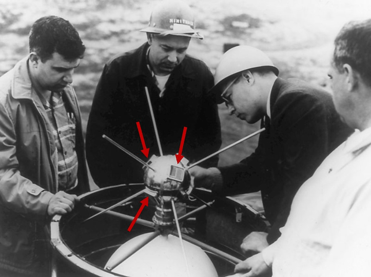 Satélite Vanguard-I, cuyo tamaño era similar al de una pelota de fútbol. Las flechas señalan la ubicación de las células solares que suministraban la energía del satélite.
