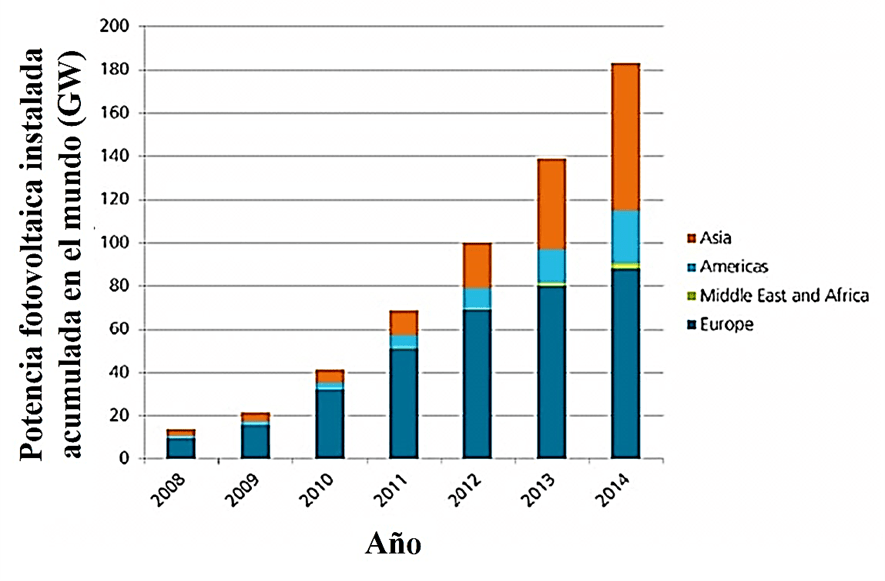 En los últimos años, la potencia fotovoltaica instalada acumulada en todo el mundo no ha dejado de crecer un año tras otro, como muestra la figura. Los valores mostrados en la gráfica son una prueba de que la apuesta por esta fuente de energía es imparable y alcanza a todo el planeta: