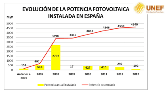 En el caso concreto de nuestro país, desde el año 2007 se hizo una apuesta firme por esta energía, mediante diversos decretos que establecieron primas a los productores de energía fotovoltaica, pero el sistema de retribuciones establecidas en 2007 estuvo mal diseñado, ya que no puso límites a la capacidad instalada, lo que provocó el boom de instalaciones del año 2008 y todo el desaguisado y el caos regulatorio que vino con posterioridad. La evolución de la potencia instalada en España se muestra en la siguiente gráfica: