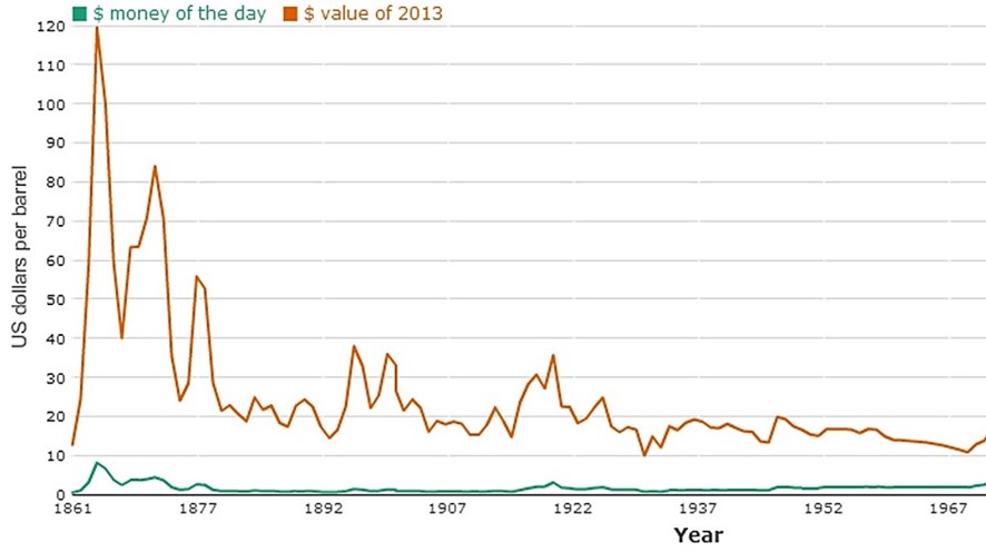 Precio del barril de petróleo (1 barril = 159 litros) para el período 1860-1970. Línea verde: precios nominales; línea naranja: precios ajustados a la inflación hasta 2013. Fuente: Historical crude oil price