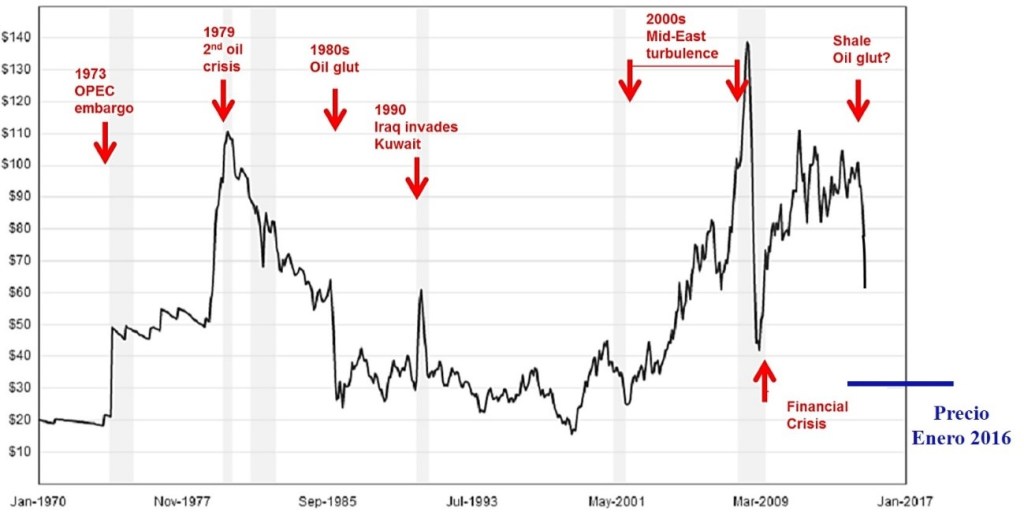 Evolución del precio del barril de petróleo desde 1970. Precios ajustados a la inflación hasta 2015, con indicación de los acontecimientos que influyeron en sus variaciones. La figura recoge los inicios de la bajada de finales de 2014. Está indicado el precio del barril en enero de 2016. Fuente: “Crude oil price history 1970-2014”