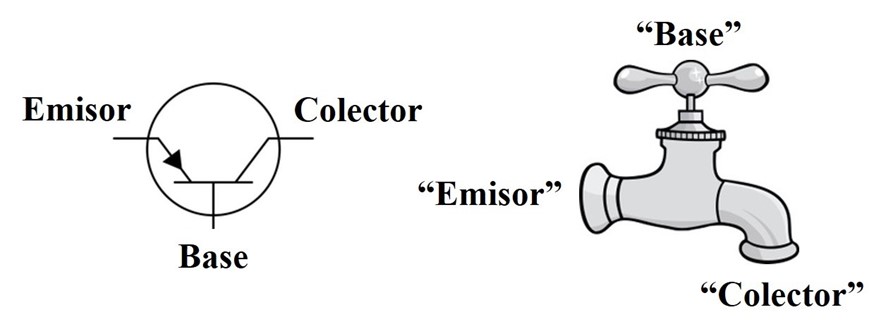 Su funcionamiento se puede asimilar al de un grifo de agua (derecha de la imagen): el agua que circula por una tubería (emisor) sale hacia la boca del grifo (colector) a través de una llave (base) que abre o cierra el flujo de agua, controlando su caudal. En el transistor, el agua es la corriente eléctrica y la llave de paso que gobierna su funcionamiento, la base. Mediante este mecanismo de control, el transistor puede modificar, amplificar, desfasar y modular señales eléctricas, operaciones todas ellas imprescindibles para el correcto funcionamiento de la totalidad de los electrodomésticos y equipos electrónicos que utilizamos en nuestra vida diaria.