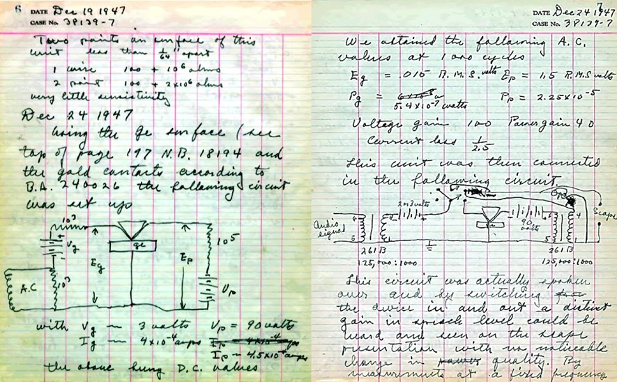 En las navidades de 1947, el equipo dio con la solución, al fabricar un prototipo que hacía lo mismo que las válvulas de vacío (amplificar señales eléctricas), pero con un material semiconductor, el germanio. Durante el mes de diciembre de 1947, particularmente el día de Nochebuena, Walter Brattain escribió en su cuaderno de laboratorio los detalles esenciales del dispositivo que propiciaría en los años posteriores una de las revoluciones silenciosas más importantes del siglo XX: había nacido el transistor.