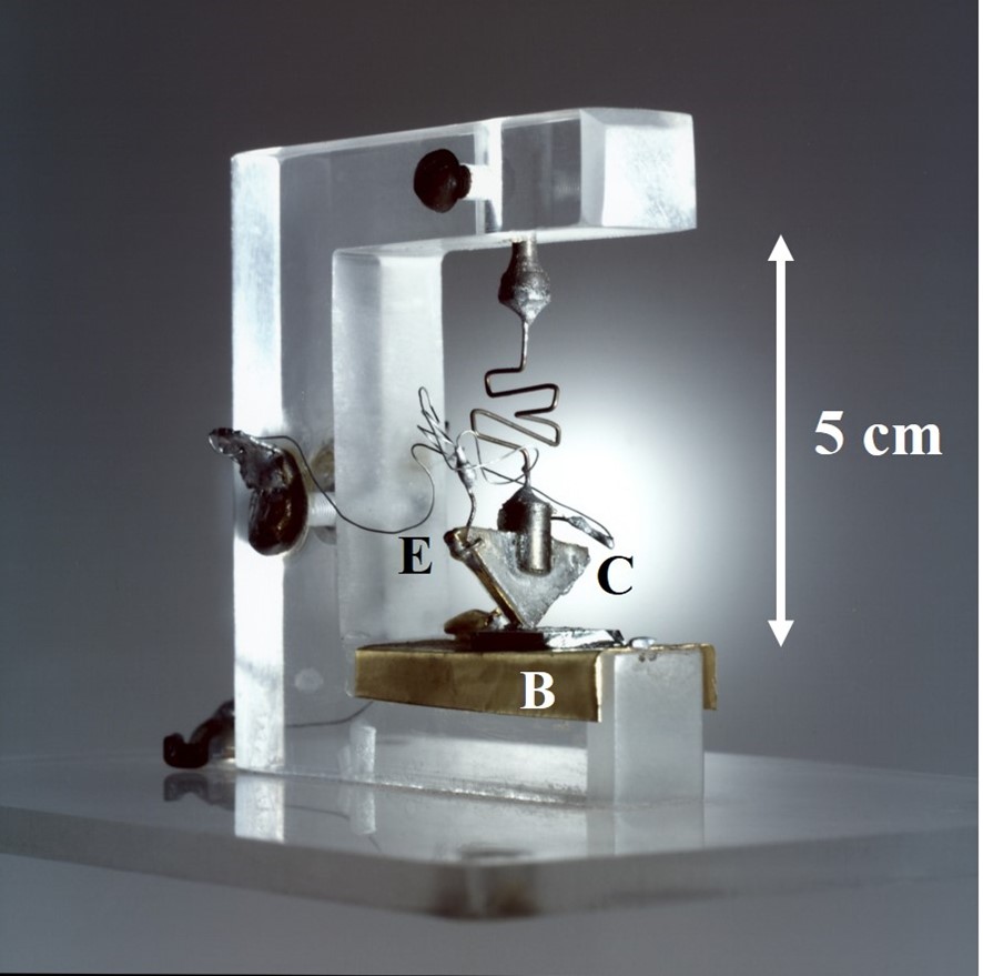 Imagen del primer transistor, tal y como se conserva hoy día en el Bell System Memorial, identificando los tres terminales del dispositivo. Los transistores modernos tienen un tamaño extraordinariamente más reducido, para poder incorporarlos en los circuitos integrados.