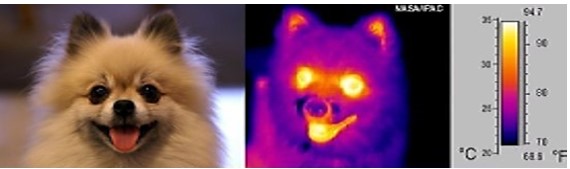 Imagen visible (izquierda) e infrarroja (centro) de la cabeza de un perro. La escala de la derecha identifica los colores de la imagen con la temperatura a la que se encuentra cada zona