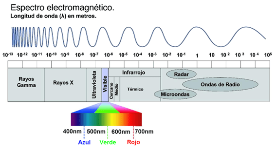 Atendiendo a los valores de sus longitudes de onda, en el espectro electromagnético se sitúan, de mayor a menor, las siguientes categorías: ondas de radio, microondas, infrarrojos, luz visible, rayos ultravioleta, rayos X y rayos gamma. Según nos movemos desde las ondas de radio a los rayos gamma, la longitud de onda disminuye y la frecuencia y la energía aumentan. La siguiente figura muestra el espectro electromagnético, con los diferentes rangos de longitudes de onda, así como la zona donde se sitúan el rango visible y el infrarrojo (en lo que sigue, IR):