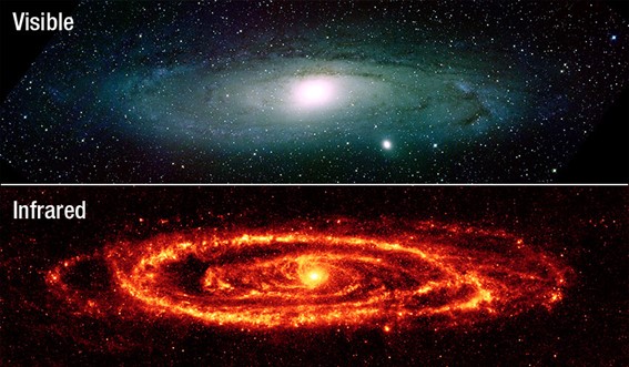 La astronomía IR proporciona una información sobre el universo que no podemos obtener con la radiación visible. La siguiente imagen muestra la galaxia más cercana a la nuestra, Andrómeda, tomada en el visible y en el IR: