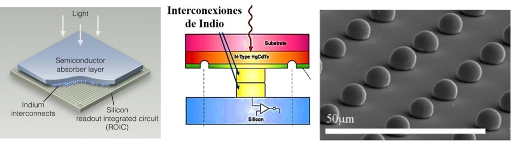 Izquierda: esquema de una matriz de detectores IR (arriba) y de su circuito integrado de lectura (abajo). Centro: esquema de la conexión de la matriz con el circuito integrado de lectura. Derecha: imagen de los “bumps” de indio que conectan cada pixel del sensor con el circuito de lectura.
