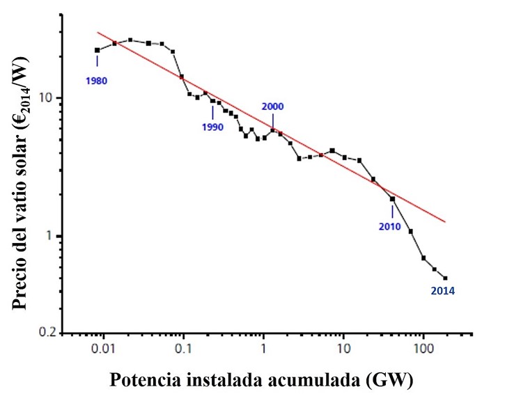Curva de aprendizaje de la energía solar fotovoltaica. El eje vertical muestra el precio del vatio solar, expresado en €2014/W; el eje horizontal detalla la potencia instalada acumulada en el mundo, expresada en GW. Ambas escalas son logarítmicas.