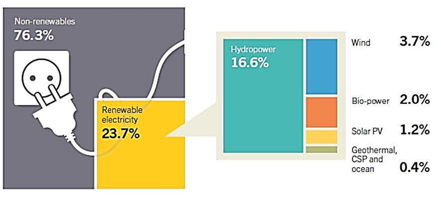 Participación estimada de las energías renovables en la producción mundial de electricidad durante el año 2015. Fuente: Renewables 2016 Global Status Report