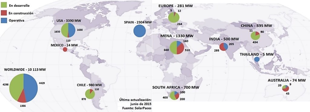 La organización SolarPaces, una red mundial formada por investigadores y empresas cuyo objetivo es el desarrollo de la tecnología termosolar, ha elaborado un mapamundi de la situación de esta tecnología, que se muestra en la siguiente imagen: