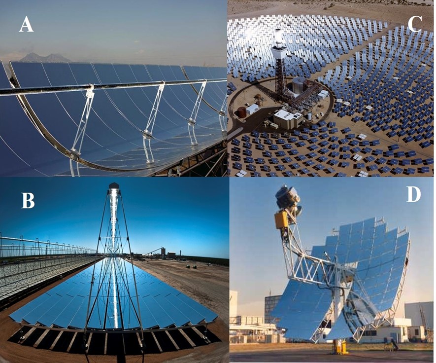 Los cuatro tipos de centrales termosolares: (A) Lineales; (B) Espejos de Fresnel; (C) De torre; (D) Stirling