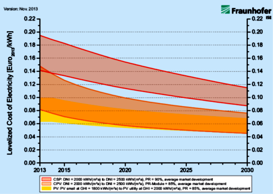 Un reciente estudio realizado por el Fraunhofer Institut, demuestra que si bien se lograrán reducciones significativas de precios en los próximos años, el coste de la electricidad de origen termosolar seguirá siendo superior al de las otras fuentes renovables. Sólo en zonas con altos niveles de irradiación (por encima de 2000 kWh/m2/año, típico del sur de Europa y norte de África) podrá ser competitiva. No obstante, su capacidad de almacenamiento a gran escala la hace una tecnología sumamente atractiva, con lo que puede compensar unos costes algo superiores.