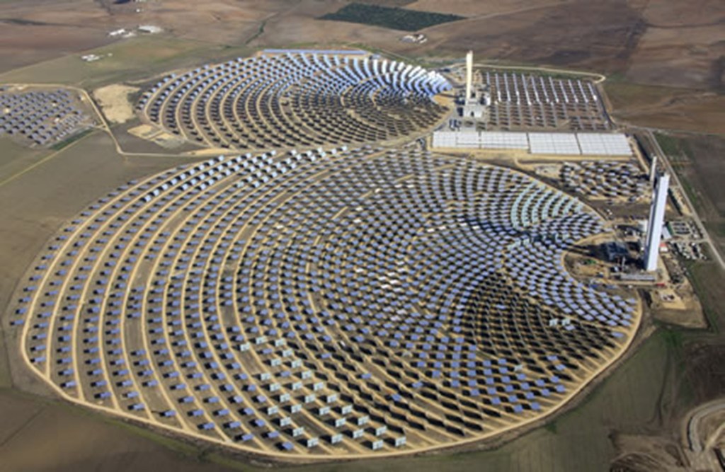 La siguiente imagen muestra la central Solucar, que es la primera central termosolar comercial de torre central y campo de helióstatos instalada en el mundo, construida por Abengoa Solar: