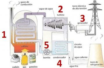 En las centrales térmicas, que son las responsables en la actualidad del 85 % del total de energía eléctrica producida en el mundo, el proceso de producción de electricidad, sea cual sea el combustible que utilicen (carbón, fuel, gas o uranio) se ilustra en la siguiente imagen, donde se pueden ver con más detalle los diferentes elementos que la integran: