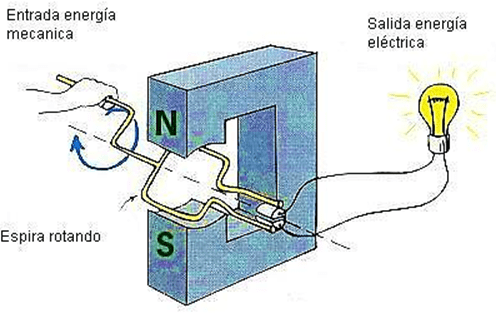 La figura ilustra de manera simplificada la Ley de Faraday: la fuerza del agua cayendo de una determinada altura, las aspas de un molino eólico o el vapor de agua que mueve la turbina es la mano de la imagen, la turbina es la espira; finalmente el generador (conocido como alternador), lo forman el conjunto de espira e imán, que tiene identificados sus polos en la imagen. Durante el giro de la espira, se produce en esta una variación del flujo magnético que enlaza al girar en presencia del imán; debido a eso, en la espira se induce una tensión eléctrica que es a su vez la causa de que circule corriente por la bombilla situada a la salida del generador, dando lugar a la transformación de la energía mecánica en eléctrica:
