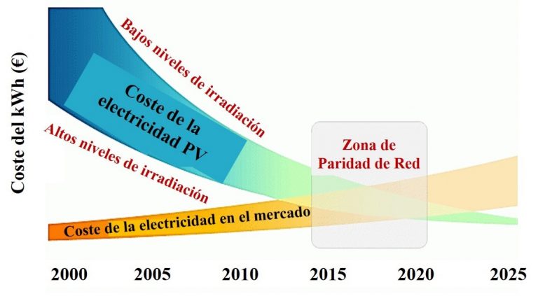 En nuestro país, donde el nivel promedio de irradiación es de 1500 kWh/m2.año y donde el precio de la electricidad está en niveles de 0.08-0.12 €/kWh, prácticamente todo el territorio nacional se encuentra en situación de paridad de red desde mediados de 2013.