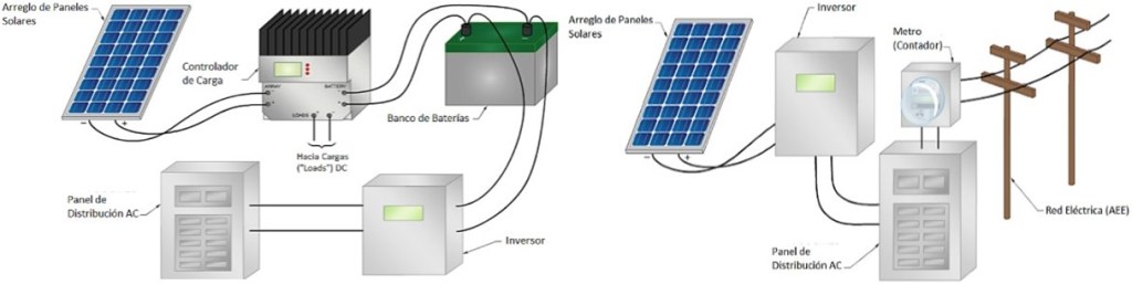 Izquierda: Sistema de autoconsumo desconectado de la red. Derecha: sistema de autoconsumo con conexión a la red eléctrica; nótese en este segundo caso la ausencia de baterías de almacenamiento.