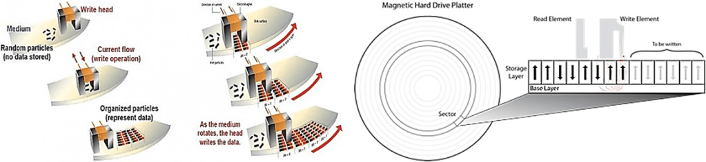 Cuando el HD no tiene datos almacenados, los imanes del recubrimiento superficial del plato no tienen ninguna orientación determinada. En el proceso de escritura o grabación del HD, se hace circular una corriente por la cabeza de escritura, creando en su punta un campo magnético muy intenso que, al ponerse muy cerca de la superficie del HD, polariza los imanes microscópicos de su interior y los orienta en dos direcciones opuestas, esas orientaciones son los “unos” y los “ceros” que codifican la información grabada; según va rotando el disco, la cabeza grabadora va orientándolos y por consiguiente, escribiendo los datos. La figura lo ilustra de forma muy intuitiva: