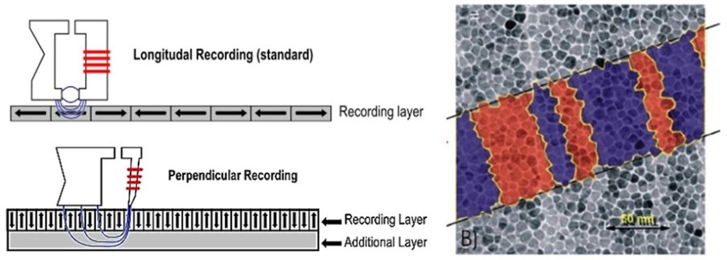 Izquierda: grabación en horizontal (arriba) y en vertical (abajo) de la capa magnética (“recording layer”) del plato de un HD. Derecha: imagen tomada por microscopía electrónica de una zona de dominios magnéticos con “imanes” microscópicos con una orientación (en naranja) u otra (en violeta) grabados. Se muestra también la escala para apreciar el tamaño que ocupa cada bit.