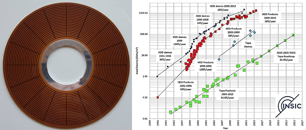La capacidad de los HD ha crecido de manera espectacular durante los últimos 50 años, lo que se muestra en la siguiente imagen, que detalla la evolución de la densidad de almacenamiento por unidad de área desde principios de los 90 hasta el momento presente y las proyecciones hasta 2025. La figura muestra lo que se conoce como la ley de Kryder de los HD, el equivalente de la ley de Moore para la densidad de transistores de un chip:
