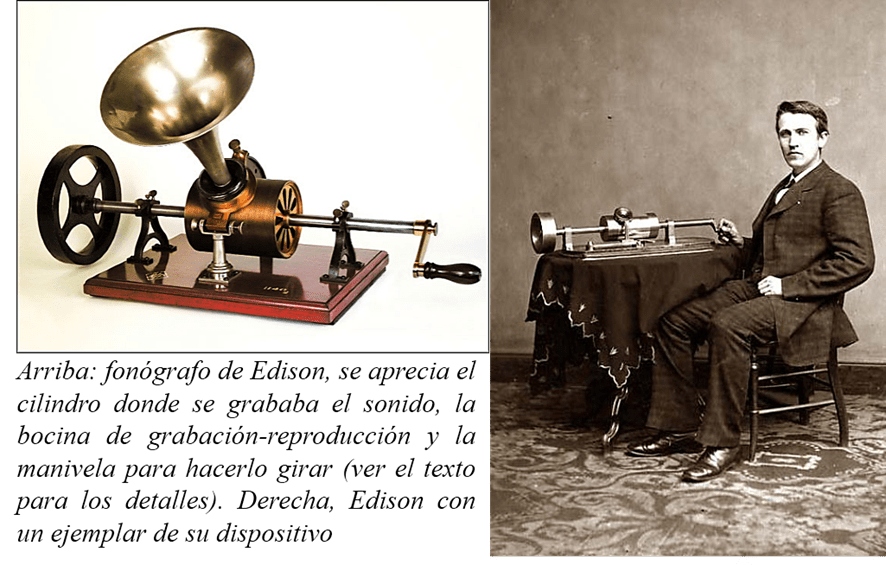 En 1881, Thomas A. Edison (1847-1931) creó un aparato capaz de transformar la energía acústica en mecánica: el fonógrafo, uno de los primeros aparatos inventados para el registro y reproducción del sonido. Tuvo algún precursor en Europa, ya que el físico francés Charles Cros (1842-1888) inventó en 1877 el paleófono, un dispositivo similar al concebido por Edison, aunque no alcanzó la fama del fonógrafo. La figura muestra una imagen del dispositivo y de su inventor: