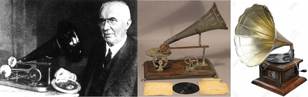 Izquierda: Berliner con su invento. Centro: una copia fiel del gramófono original. Derecha: un gramófono de los años 30 del siglo XX.