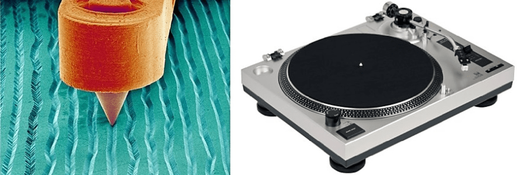 Izquierda: imagen tomada mediante microscopía electrónica de barrido de la aguja de un tocadiscos recorriendo los microsurcos de un disco de vinilo durante su reproducción, la imagen tiene 80 aumentos. Derecha: plato de un equipo reproductor moderno