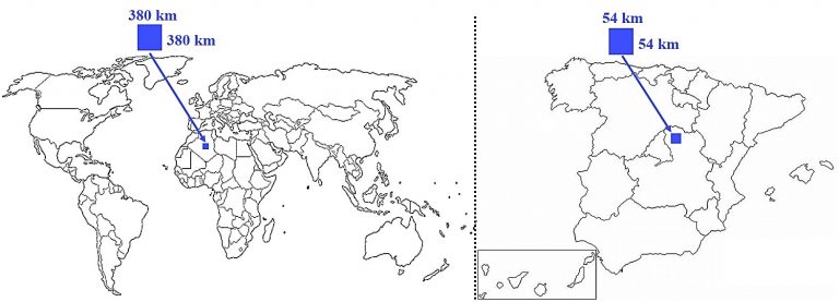 Fruto de esa limitación, cualquier instalación de producción de energía fotovoltaica es muy demandante de terreno. Ahora bien, dado el enorme aporte energético que nos llega del sol, podemos plantearnos cuanta superficie se necesitaría cubrir con paneles solares para satisfacer las demandas energéticas globales.