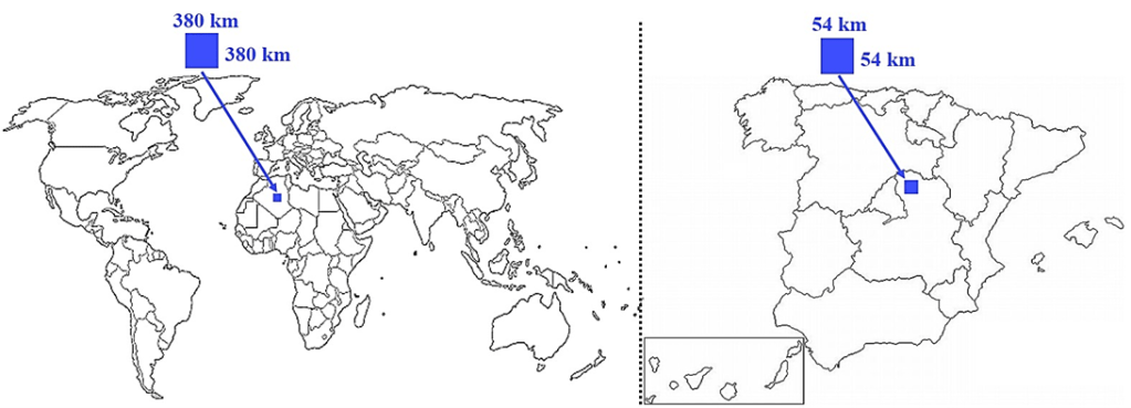 Izquierda: hipotética instalación de paneles solares situada en el desierto del Sahara que podría producir toda la energía eléctrica consumida en el mundo. Derecha: superficie de terreno que habría que cubrir con paneles solares para satisfacer la demanda de energía eléctrica en España.