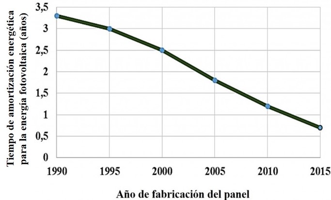 En una instalación localizada en una zona con niveles de irradiación similares a los del centro de la Península Ibérica, la evolución del TiAE ha pasado de ser superior a tres años en 1990, a algo menos de uno en la actualidad. Puesto que un panel fotovoltaico tiene una vida operativa de unos 25-30 años, más del 95% de ese tiempo la pasa produciendo energía neta adicional a la que se empleó en su fabricación e instalación.