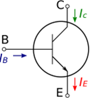 La imagen de la derecha es el símbolo circuital del transistor bipolar. El principio de su funcionamiento reside en el hecho de que la corriente en el terminal de base (IB), que es muy pequeña, permite controlar la del terminal de colector (IC), que es varios órdenes de magnitud mayor.