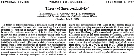 Esta teoría la concibieron en 1957 tres científicos: el propio Bardeen, Leon N. Cooper y John R. Schrieffer y se conoce desde entonces como teoría BCS, por las iniciales de sus apellidos. La teoría BCS, basada en principios de mecánica cuántica, fue todo un triunfo para la física teórica, al poder explicar satisfactoriamente la superconductividad, que había sido descubierto en 1911 por el científico holandés Heike Kamerlingh Onnes (1853-1926, Premio Nobel de física de 1913), pero que en el intento de entenderla y explicarla habían fracasado varios de los mejores físicos teóricos del mundo, entre los que se encuentran nombre tan célebres como A. Einstein, N. Bohr, R. Feynman o W. Heisenberg. Publicaron su teoría en la revista Physical Review el día 1 de diciembre de 1957, hace ahora 60 años. Este es el resumen de su artículo, tal y como puede leerse en la primera página del texto: