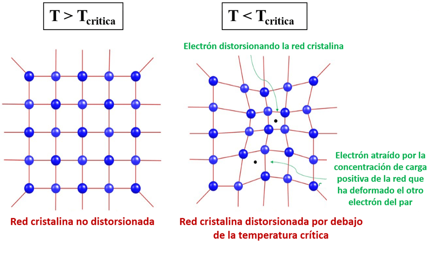 Ilustración esquemática del funcionamiento de los pares de Cooper. Izquierda: a temperaturas por encima de la temperatura crítica (que suele ser de muy pocos grados Kelvin), los átomos de una red metálica están ordenados en sus posiciones de equilibrio. Derecha: por debajo de la temperatura crítica, el paso de un electrón distorsiona la red, creando una zona local de carga positiva que atrae a un segundo electrón, formándose el par de Cooper. Fuente de la figura: elaboración propia, adaptada de este texto.