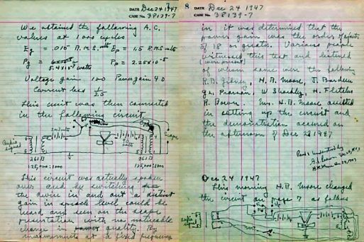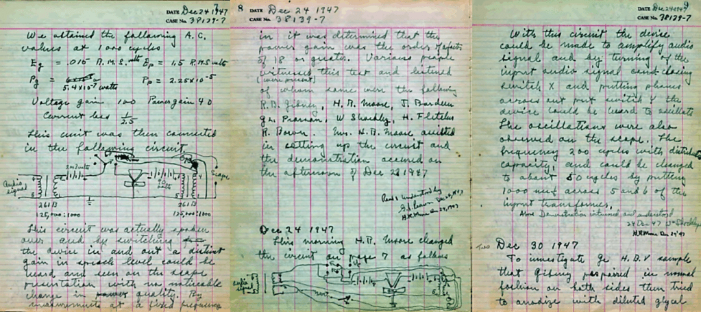 Como gran físico experimental que era, Brattain anotaba todos los pormenores del trabajo realizado en el laboratorio en un cuaderno, que es una verdadera joya, ya que en él se recogen minuciosamente los avances y los detalles del primer amplificador con semiconductores de la historia. La siguiente figura recoge las tres páginas que Brattain escribió el día de Nochebuena, 24 de diciembre de 1947, el día siguiente de la demostración del dispositivo ante los directivos del laboratorio, en la que se resumen los detalles esenciales del funcionamiento del transistor: