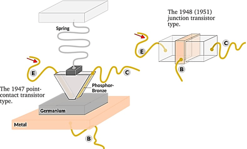El transistor ideado por Bardeen y Brattain era un dispositivo de superficie, por lo tanto, muy dependiente de la calidad y limpieza de esta. La superficie se contaminaba con facilidad, lo que hacía que su funcionamiento fuera inestable e irreproducible. El jefe del equipo, Shockley, detectó este defecto rápidamente, y pensó trasladar la zona más crítica (la Base) al interior del dispositivo. Para ello inventó el transistor de unión (Bipolar Junction Transistor). Las diferencias esenciales entre ambos dispositivos se recogen en las siguientes figuras, que muestran la estructura del transistor construido por Bardeen y Brattain y el ideado por Shockley, según se muestran en las patentes de ambos dispositivos:
