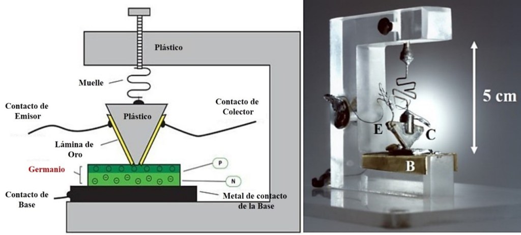 Bardeen sugirió la disposición que debían tener dos elementos esenciales del dispositivo, denominados emisor y colector, que había que situar muy próximos entre sí para su correcto funcionamiento; Brattain fue el que con su habilidad e imaginación, logró materializar con éxito el primer transistor de puntas de contacto. Para ello, construyó una pieza de plástico triangular, a la que recubrió por sus bordes con una fina lámina de oro. Con una cuchilla de afeitar separó justamente en el vértice la lámina en dos partes, dejándolas separadas unas 40 micras. El triángulo con los hilos de oro adosados en sus lados se colocó entonces encima de una pieza de un semiconductor (germanio), presionando ligeramente su superficie por medio de un muelle. Este montaje funcionó como el primer amplificador con semiconductores de la historia. La figura muestra un esquema del dispositivo, auténticamente artesanal: