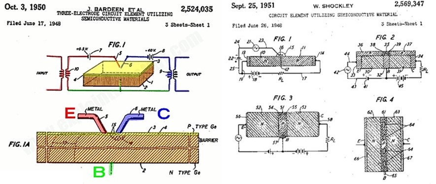 Izquierda: Figura principal -coloreada para facilitar su comprensión- de la patente US 2524035 de Bardeen y Brattain para el transistor de puntas de contacto. Derecha: figura principal de la patente US 2569347 de Shockley para el transistor de unión.