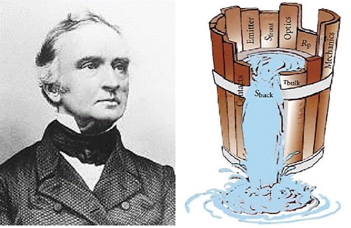 Justus Liebig y su célebre barril, aplicado a la limitación de la eficiencia de una célula solar. Fuente: S.W. Glunz, High-Efficiency Crystalline Silicon Solar Cells