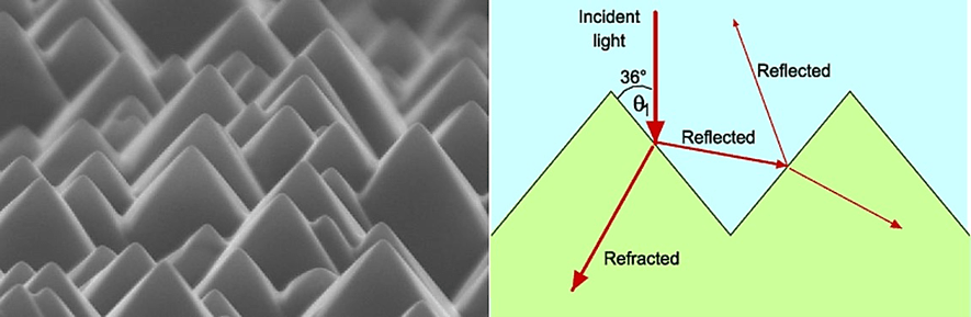 Izquierda: Imagen tomada con microscopía electrónica de barrido de una superficie de silicio texturizada. Derecha: efecto de la textura sobre la radiación solar incidente. Fuente. PVEducation.org