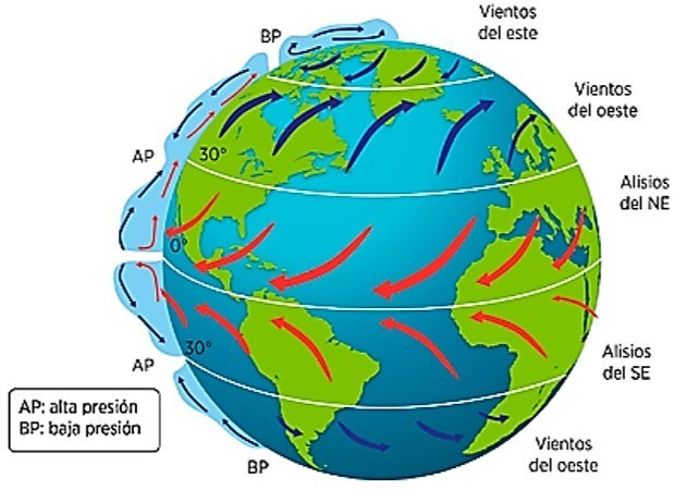 Las regiones alrededor del ecuador, situadas a 0º de latitud, se calientan por la radiación solar más que el resto de las zonas del planeta. El aire caliente, más ligero que el frío, sube hasta alcanzar una altura aproximada de 10 km y se extiende hacia el norte y el sur. Si el globo terrestre no rotara, el aire simplemente llegaría al Polo Norte y al Polo Sur. Al tener en cuenta el movimiento de rotación de la Tierra, el proceso de circulación global del aire sobre el planeta se hace mucho más complejo de analizar y entender. En el hemisferio norte, el movimiento del aire en las capas altas tiende a desviarse hacia el este y en las capas bajas hacia el oeste, por efecto de las fuerzas de inercia, denominadas fuerzas de Coriolis [2]. En el hemisferio sur ocurre al contrario.