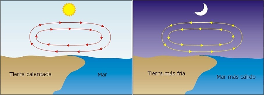 En las zonas costeras, durante el día la radiación solar calienta la tierra se calienta más rápidamente que el mar. El aire caliente sube, circula hacia el mar, y crea una depresión a nivel del suelo que atrae el aire frío del mar, esto es lo que se llama brisa marina. A menudo hay un periodo de calma al anochecer, cuando las temperaturas del suelo y del mar se igualan. Durante la noche, los vientos soplan en sentido contrario y suelen tener velocidades inferiores, debido a que la diferencia de temperaturas entre la tierra y el mar es más pequeña de lo que es durante el día, cuando hay sol. La figura muestra esquemáticamente la situación descrita: